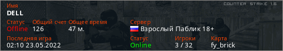 Играет на Counter Strike 1.6 сервере. Страна: РоссияПервый раз замечен 01:19 23.05.2022