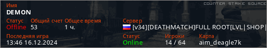 Играет на Counter Strike Source сервере. Страна: РоссияПервый раз замечен 15:50 25.04.2023