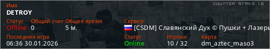 Играет на Counter Strike 1.6 сервере. Страна: РоссияПервый раз замечен 06:34 30.01.2026