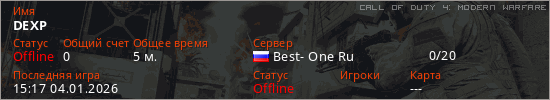 Играет на Call of Duty 4: Modern Warfare сервере. Страна: РоссияПервый раз замечен 15:00 04.01.2026