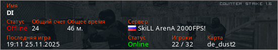 Играет на Counter Strike 1.6 сервере. Страна: РоссияПервый раз замечен 12:15 23.05.2023
