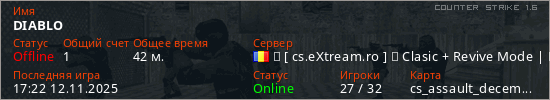 Играет на Counter Strike 1.6 сервере. Страна: РумынияПервый раз замечен 12:51 07.01.2025