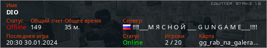 Играет на Counter Strike 1.6 сервере. Страна: РоссияПервый раз замечен 22:02 18.02.2023
