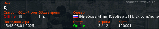 Играет на Counter Strike 1.6 сервере. Страна: РоссияПервый раз замечен 09:53 15.01.2022