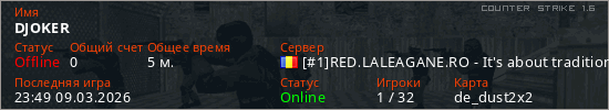 Играет на Counter Strike 1.6 сервере. Страна: РумынияПервый раз замечен 23:47 09.03.2026