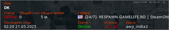 Играет на Counter Strike 1.6 сервере. Страна: СШАПервый раз замечен 02:12 21.05.2025