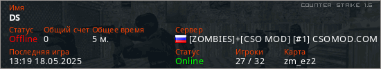 Играет на Counter Strike 1.6 сервере. Страна: РоссияПервый раз замечен 13:17 18.05.2025