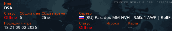 Играет на Counter Strike Global Offensive сервере. Страна: РоссияПервый раз замечен 19:15 01.02.2026
