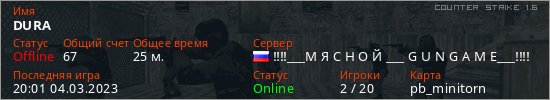 Играет на Counter Strike 1.6 сервере. Страна: РоссияПервый раз замечен 19:38 04.03.2023