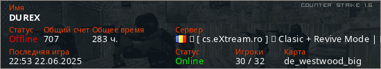 Играет на Counter Strike 1.6 сервере. Страна: РумынияПервый раз замечен 20:11 17.03.2025