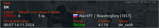 Играет на Counter Strike 1.6 сервере. Страна: РоссияПервый раз замечен 23:59 13.11.2024