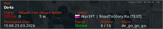 Играет на Counter Strike 1.6 сервере. Страна: РоссияПервый раз замечен 15:04 25.03.2026