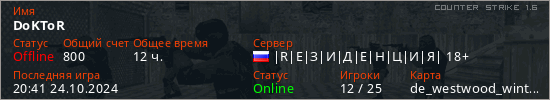 Играет на Counter Strike 1.6 сервере. Страна: РоссияПервый раз замечен 17:47 26.02.2019