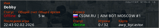 Играет на Counter Strike 1.6 сервере. Страна: РоссияПервый раз замечен 22:35 02.02.2026