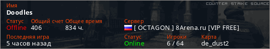 Играет на Counter Strike Source сервере. Страна: РоссияПервый раз замечен 06:48 08.08.2021