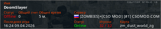 Играет на Counter Strike 1.6 сервере. Страна: РоссияПервый раз замечен 16:07 09.04.2026