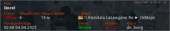 Играет на Counter Strike 1.6 сервере. Страна: ГерманияПервый раз замечен 15:07 23.10.2024