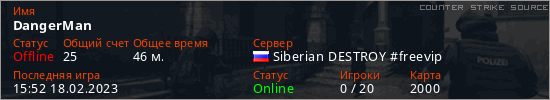 Играет на Counter Strike Source сервере. Страна: РоссияПервый раз замечен 08:10 18.02.2023
