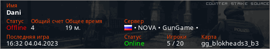 Играет на Counter Strike Source сервере. Страна: РоссияПервый раз замечен 15:12 03.03.2023