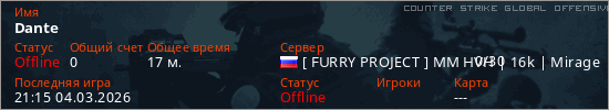 Играет на Counter Strike Global Offensive сервере. Страна: РоссияПервый раз замечен 20:51 04.03.2026