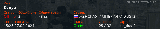 Последний раз был в сети 15:25 27.02.2024 Игрок с таким ником замечен на 41 сервере
