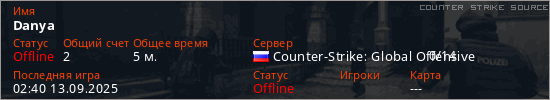 Играет на Counter Strike Source сервере. Страна: РоссияПервый раз замечен 01:52 13.09.2025