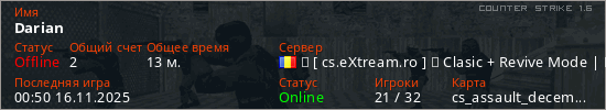 Играет на Counter Strike 1.6 сервере. Страна: РумынияПервый раз замечен 05:35 14.11.2025