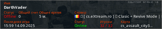 Играет на Counter Strike 1.6 сервере. Страна: РумынияПервый раз замечен 15:53 14.09.2025