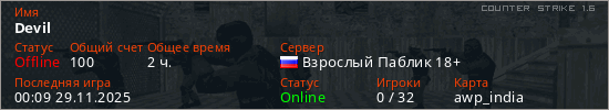 Играет на Counter Strike 1.6 сервере. Страна: РоссияПервый раз замечен 15:21 21.10.2021