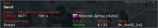 Играет на Counter Strike 1.6 сервере. Страна: РоссияПервый раз замечен 18:28 24.09.2021