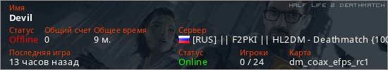 Играет на Half Life 2 DeathMatch сервере. Страна: РоссияПервый раз замечен 09:22 07.03.2026