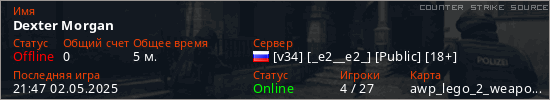 Играет на Counter Strike Source сервере. Страна: РоссияПервый раз замечен 21:38 02.05.2025