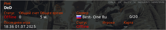 Играет на Call of Duty 4: Modern Warfare сервере. Страна: РоссияПервый раз замечен 18:34 01.07.2025