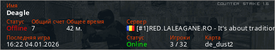 Играет на Counter Strike 1.6 сервере. Страна: РумынияПервый раз замечен 23:20 22.06.2022