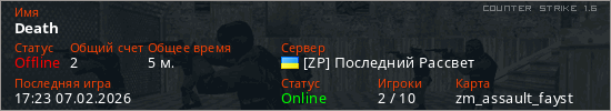 Играет на Counter Strike 1.6 сервере. Страна: УкраинаПервый раз замечен 16:47 07.02.2026