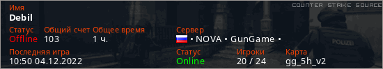 Играет на Counter Strike Source сервере. Страна: РоссияПервый раз замечен 19:43 03.12.2022