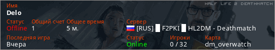 Играет на Half Life 2 DeathMatch сервере. Страна: РоссияПервый раз замечен 16:04 12.01.2026
