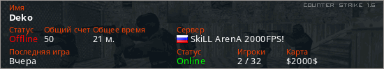 Играет на Counter Strike 1.6 сервере. Страна: РоссияПервый раз замечен 19:39 08.11.2025