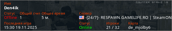 Играет на Counter Strike 1.6 сервере. Страна: СШАПервый раз замечен 15:01 19.11.2025