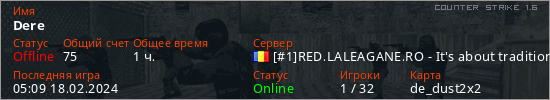 Играет на Counter Strike 1.6 сервере. Страна: РумынияПервый раз замечен 08:57 23.03.2023
