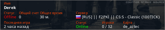 Играет на Counter Strike Source сервере. Страна: РоссияПервый раз замечен 20:48 15.02.2026