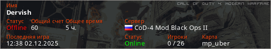 Играет на Call of Duty 4: Modern Warfare сервере. Страна: РоссияПервый раз замечен 21:26 23.11.2023