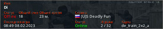 Играет на Counter Strike 1.6 сервере. Страна: РоссияПервый раз замечен 15:31 10.02.2022