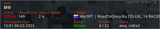 Играет на Counter Strike 1.6 сервере. Страна: РоссияПервый раз замечен 21:49 05.02.2023