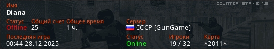 Играет на Counter Strike 1.6 сервере. Страна: РоссияПервый раз замечен 13:54 12.08.2023