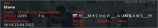 Играет на Counter Strike 1.6 сервере. Страна: РоссияПервый раз замечен 14:39 21.04.2022