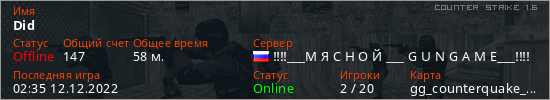 Играет на Counter Strike 1.6 сервере. Страна: РоссияПервый раз замечен 01:39 12.12.2022