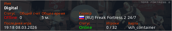 Играет на Team Fortress 2 сервере. Страна: РоссияПервый раз замечен 18:29 08.03.2026