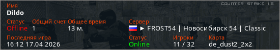 Играет на Counter Strike 1.6 сервере. Страна: РоссияПервый раз замечен 14:24 17.04.2026
