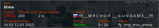 Играет на Counter Strike 1.6 сервере. Страна: РоссияПервый раз замечен 21:19 07.01.2023